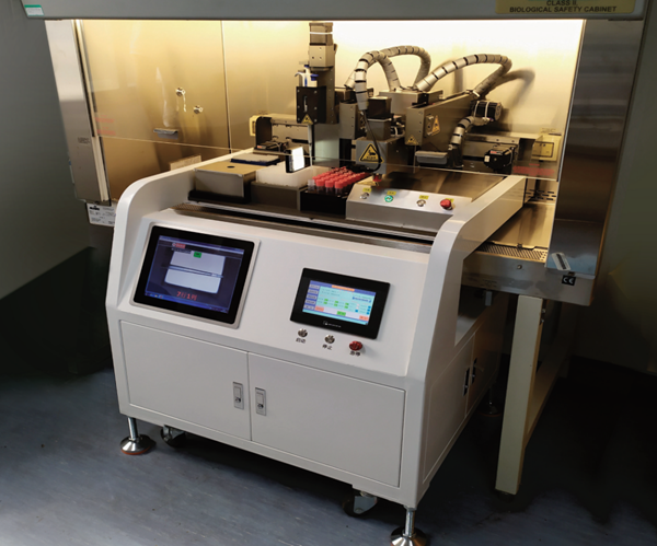 采用加样机器人,全程操作在生物安全柜中进行,人与生物样本“零开放式接触”,可以一键式完成核酸检测中样本的开盖、转移、关盖操作,实现“零开放式接触”原始样本管直接上机、自动开盖、自动关盖、样本转移,高效视觉识别系统,液体捕获无滴漏,避免交叉污染,完成96个样本前处理仅需24分钟,适用于新冠疫情防控、临床检测、疾病防控、食品安全、法医等领域核酸检测。